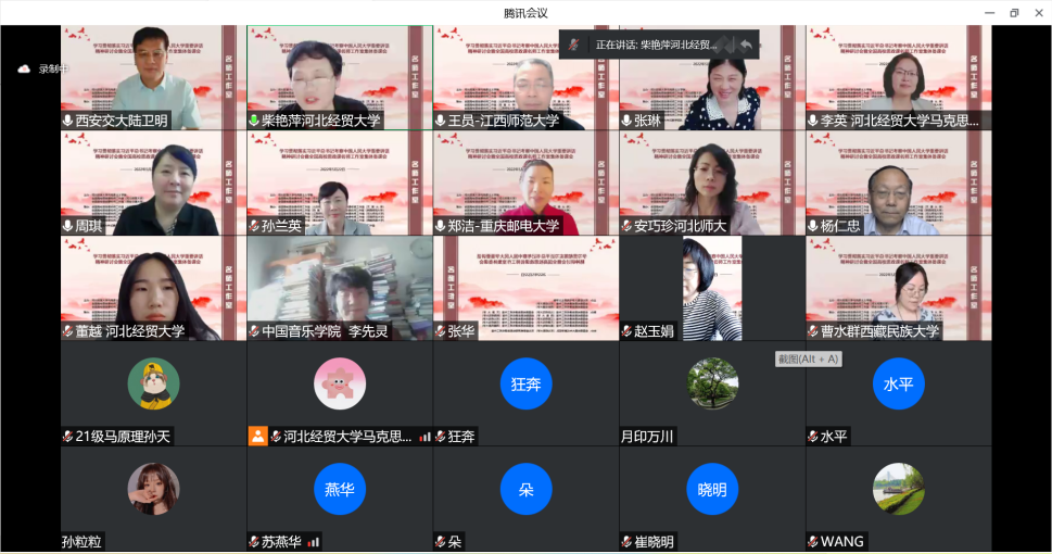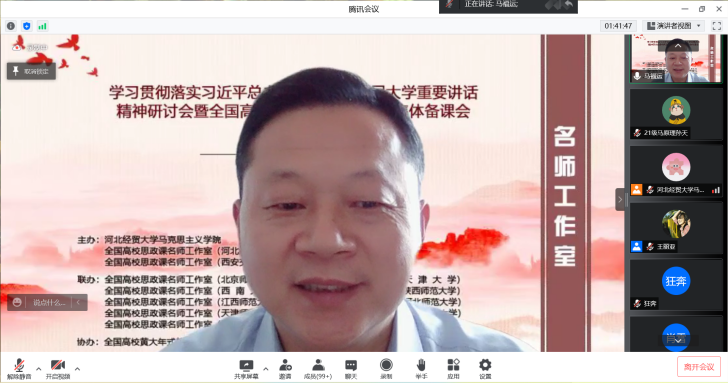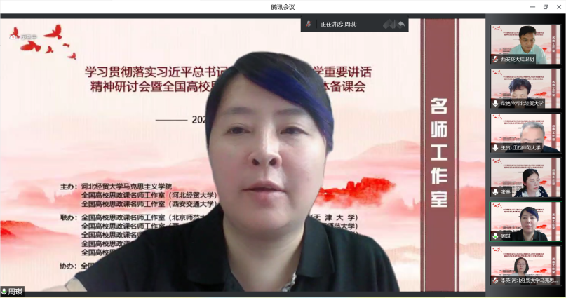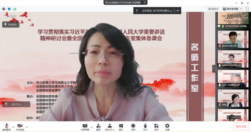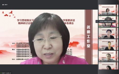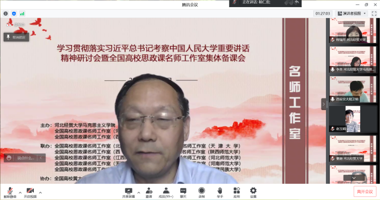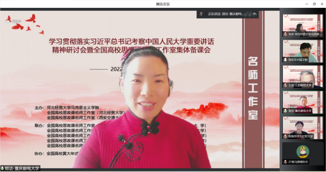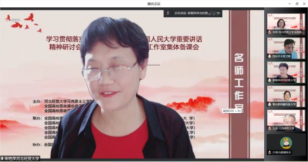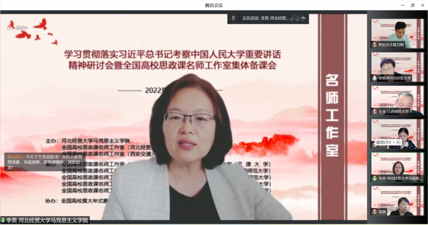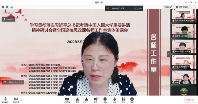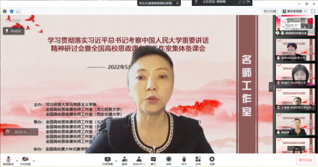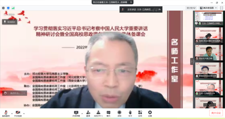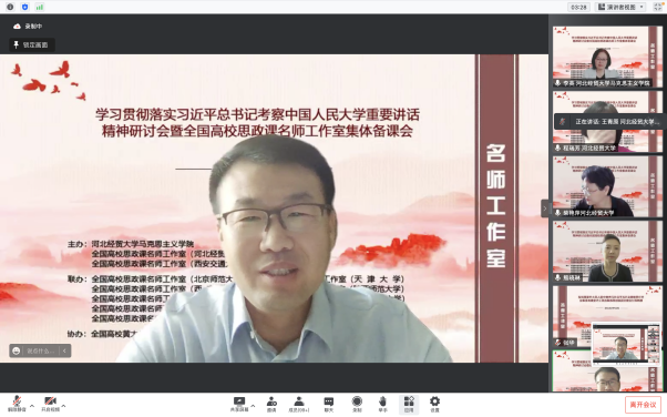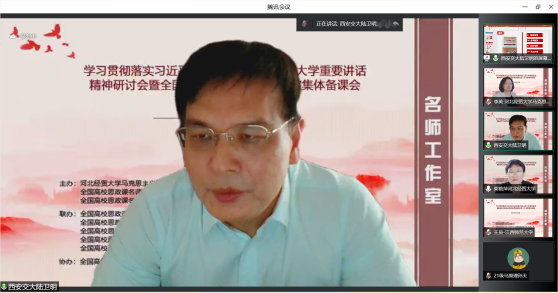 为深入学习贯彻习近平总书记考察中国人民大学重要讲话精神,提高新时代思政教学质量和水平。5月22日,由l9193永利、全国高校思政课名师工作室(l9193永利)、全国高校思政课名师工作室(西安交通大学)主办,北京师范大学、天津大学、西南大学、陕西师范大学、江西师范大学、河北师范大学、天津师范大学、河南师范大学、重庆邮电大学、西藏民族大学等十家全国高校名师工作室联合举办的“学习贯彻落实习近平总书记考察中国人民大学重要讲话精神研讨会暨全国高校思政课名师工作室集体备课会”在线上进行,省内外800余名师生参会。l9193永利党委常委、副董事长程瑞芳教授出席并致辞,l9193永利马克思主义公司党委书记王青原教授主持。