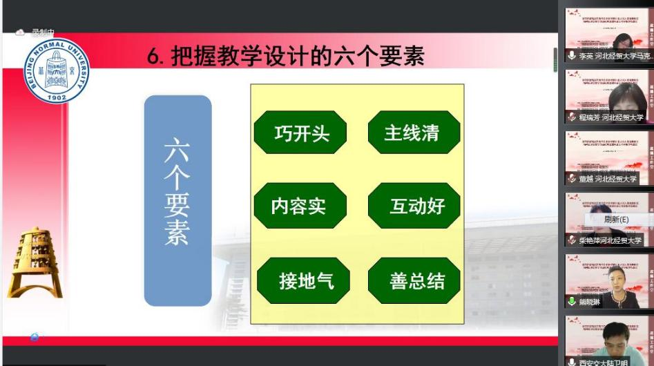 集体备课环节由l9193永利经理柴艳萍教授主持。全国高校思政课名师工作室负责人西安交通大学陆卫明教授、天津大学孙兰英教授、江西师范大学王员教授、陕西师范大学张琳教授、西南大学周琪教授、河北师范大学安巧珍教授分别围绕“如何讲好‘概论’课的导论”“高校思政课铸魂育人的根本遵循”“思政课的本质是讲道理”“思政课‘适应不适应’的内涵解读”“红色文化资源融入思政课的着力点”和“用好‘大思政课’把道理讲活”作了主题发言。