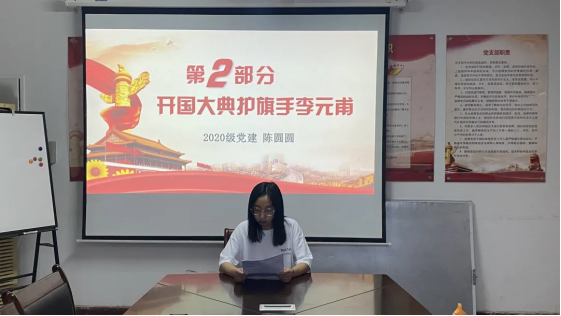 宣讲活动第十一讲,由2020级陈园园同学讲述了作为新中国开国大典4名护旗手之一李元甫同志见证首面五星红旗升起的故事。为确保10月1日新中国开国大典上升旗仪式的万无一失,包括李元甫在内的四名护旗手站在国旗下严阵以待,负责电动升旗装置发生意外时进行手动升旗。因此,近距离的见证了新中国首面五星红旗冉冉升起的过程。事后,李元甫在数次演讲中,总会用“国是大家,没有这个大家,哪里能有我们各自的小家。五星红旗是先烈们用他们的鲜血染红的,没有他们,哪有我们今天的幸福生活。你们都正当年轻,风华正茂,当立志报国,成为国之栋梁,让我们的祖国变得更加富强”这样的话作为演讲的结尾。李元甫认为一生中最光荣的身份就是担任了“开国大典护旗手”,这对他来说是“天大的幸运”和“一辈子的骄傲”。