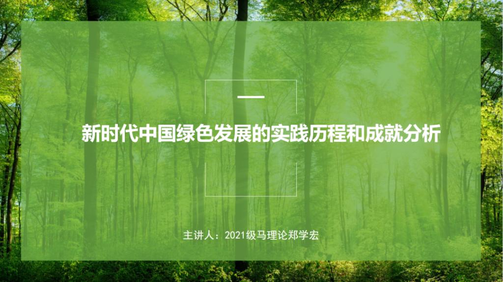 郑学宏同学主讲的题目为《新时代中国绿色发展的实践历程和成就分析》。过去十年,在党中央的坚强领导下,我们提出并贯彻新发展理念,着力推进高质量发展,推动构建新发展格局,绿色发展观念深入人心。我们坚持绿水青山就是金山银山的“两山”理念,使生态环境保护发生了历史性、转折性、全局性变化。我们将生态文明建设纳入“五位一体”总体布局,使我们对中国特色社会主义建设规律的认识更为深入。党的二十大报告做出了“人与自然和谐共生的现代化是中国式现代化的重要特征”这一重要论述,这从认识论的层面深刻揭示了人与自然和谐共生的内在逻辑,并丰富和发展了党关于人与自然关系的理论,为我们把人与自然和谐共生作为中国式现代化道路的前提选择提供了重要方法论指导。