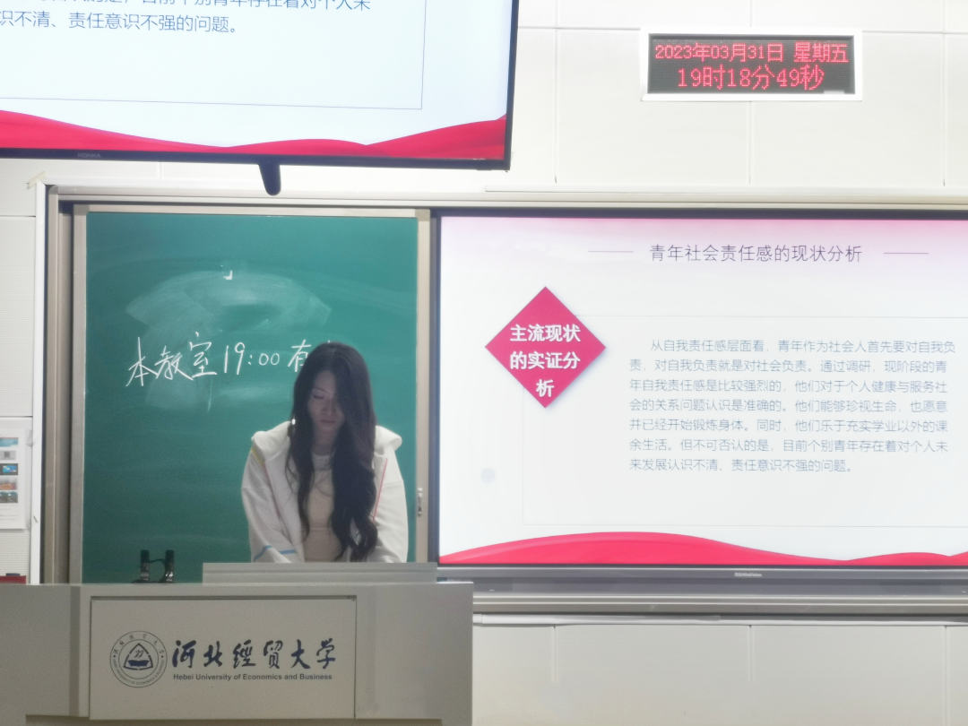 3月31日晚,公司“践行二十大,学‘习’讲故事”学习贯彻二十大精神系列活动第三期在北三教A104举行。系列活动第三期以“社会责任感”为主题,共有四位主讲人参与主讲,第二讲主讲人为2022级马克思主义理论专业研究生任乐,主讲题目为《青年社会责任感的培养》。全院59名研究生参加了此次活动。