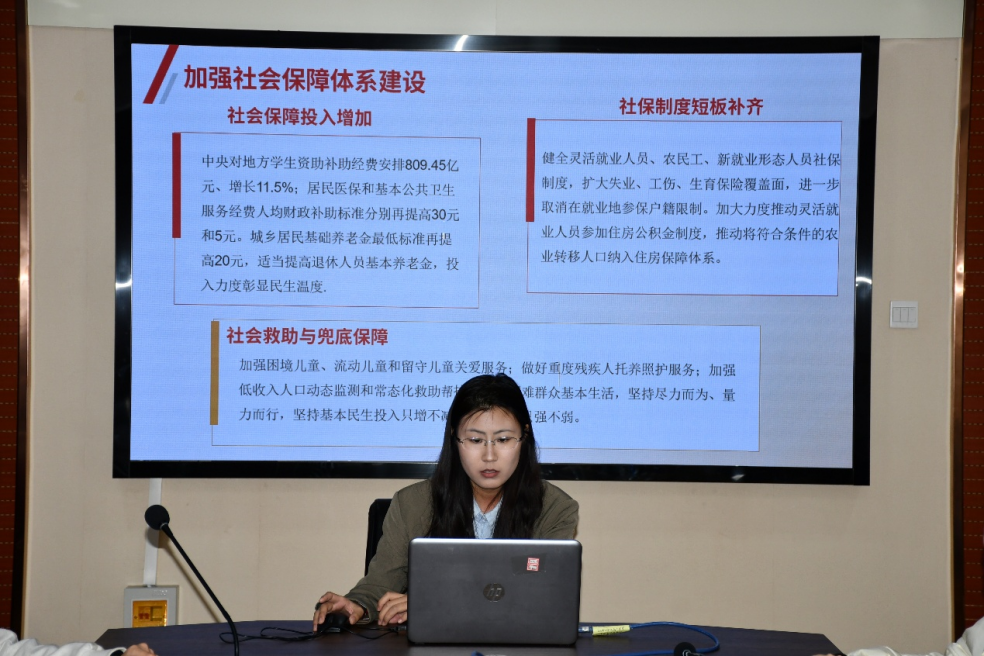 孙玉娇同学主要介绍了中国式现代化进程中推进民生建设的基本遵循、实践进路、现实成就及发展目标;齐赏同学围绕民生福祉的基本内涵进行解读,阐述了优化社会保障结构与增进民生福祉之间的内在联系;李宗琦同学聚焦民生品质提升,阐述了助力民生福祉增量提质的实践路径;韩梦林同学分享了民生工程的重要意义、发展现状及未来展望,强调新形势下要凝聚发展合力,厚植民生福祉。
