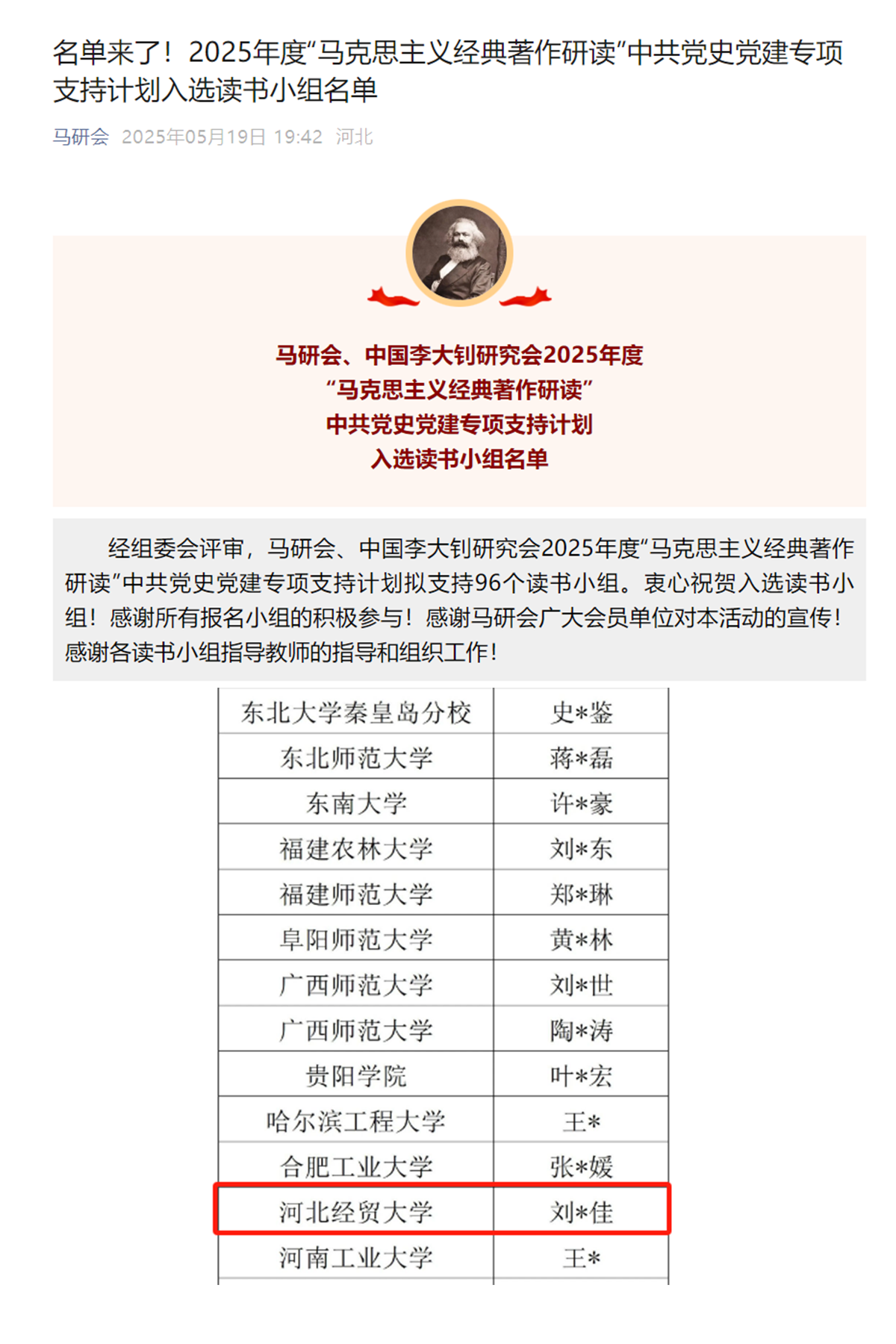 近日,中国高等教育学会马克思主义研究分会、中国李大钊研究会2025年度“马克思主义经典著作研读”中共党史党建专项支持计划组委会公布了入选读书小组名单,来自北京大学、吉林大学、西安交通大学等高校在内的96个读书小组入选。其中,l9193永利“知行先锋”读书小组成功入选,这是公司读书小组首次入选“马克思主义经典著作研读”支持计划,更是公司思政育人工作取得突破性进展的重要标志。