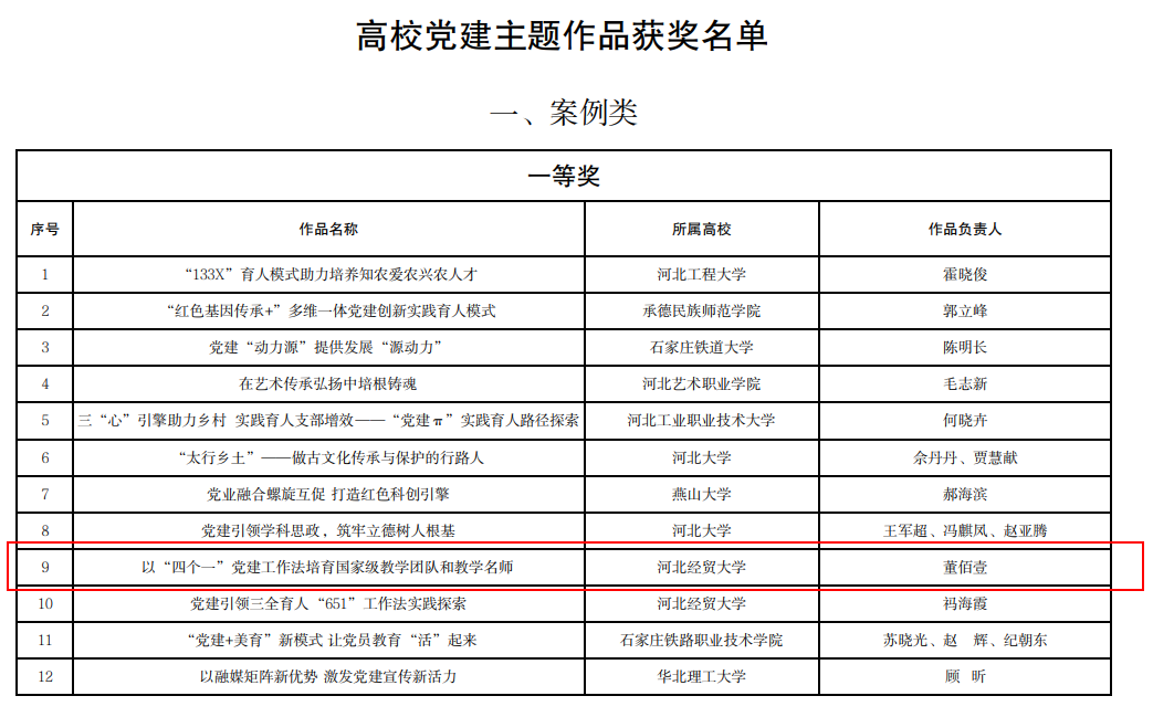 近日,中共河北省委教育工作委员会下发的《关于公布2024年高公司党建主题作品评选结果的通知》(冀教党建函〔2024〕16号),公司党委书记董佰壹牵头的《以“四个一”党建工作法培育国家级教学团队和教学名师》党建项目荣获省级一等奖。