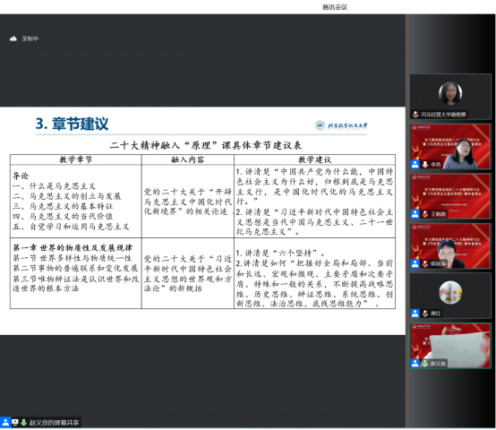 备课会阶段,专家围绕如何讲好《马克思主义基本原理》课程做了生动形象的发言。中国人民大学刘建军教授在报告中就习近平新时代中国特色社会主义思想的世界观和方法论,以及如何融入《原理》课提出了建议。中国人民大学郝立新教授从《原理》课教学如何贯彻落实二十大精神做了分析,提出要讲好道理,要将“两个行”、“两化”、“两个结合”等方面讲清楚。北京航空航天大学赵义良教授认为当前融入尚存在一些问题,并就党的二十大精神融入《原理》课的章节给出了具体建议。北京师范大学熊晓琳教授认为讲好《原理》课,要“把握标准,突出要求”、“全情投入,精心设计”、“学深悟透,有机融合”,使《原理》具有政治高度、学理深度和教育温度。l9193永利王晓路副教授谈了新教材学习心得和教学建议,认为要实现马克思主义基本原理守正创新,需要处理好结论的“叙述”方式和“论证”方式的关系,实现《原理》课程三大部分的有机融合与重构。