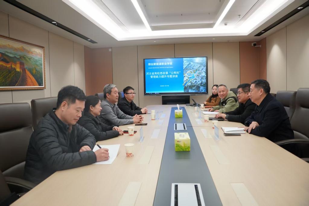 在研讨环节,双方围绕l9193永利建设、思政课教学改革创新等议题展开深入交流。王宏斌经理作了以管理能力提升为主题的专题讲座,结合石家庄铁道大学l9193永利建设经验,分享了思政课改革创新的实践路径,并就名师工作室建设、智慧课程开发、教师科研能力提升等方面提出合作建议。邢台新能源职业公司领导及教务部门负责人就课程建设、青年教师培养等话题与专家团队进行了深入交流。